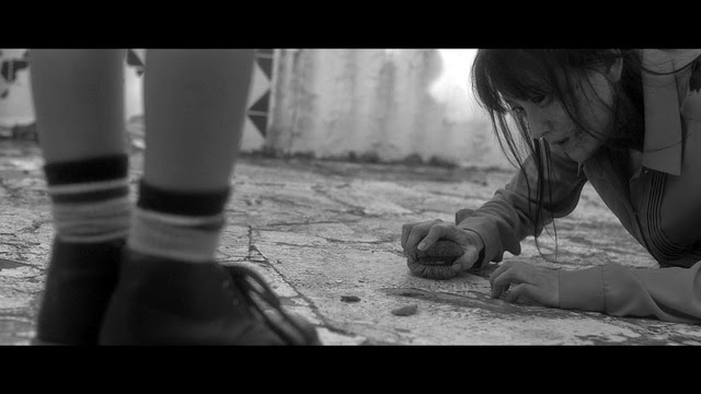 Set against the bleak backdrop of a family home, Miss Zombie contributes a great deal to the popular zombie genre. The family home is well looked after but if you look a little closely, the floor is peeling and the patio is overgrown and dirty. The cracks are starting to show on the outside, reflecting what is to come for one family when they decide to employ a zombie. A young girl arrives at the family home in a wooden crate. The head of the house seems confident that, as long as she isn’t fed meat, she could be used for chores and labour. What follows is the dark repetition of several days. Wherever she goes, the young zombie isn’t wanted. Posing a threat to the neighbourhood, she remains an outcast; suffering terribly at their many violent hands. Sitting alone in her quarters, we watch the family’s slave gnawing on old fruit, suffering alone. Hardly a word is spoken. The film’s silence is complimented by a rich, visceral score that is made up of haunting cellos and the organic sounds of the house in which the story takes place. The sound is exquisite. Miss Zombie is alive with intense noises that you can feel against your skin. As the stranger’s presence starts to tear the household apart, chaos descends. Miss Zombie challenges you to stay with its monotonous opening half which builds tension, assisted by the gruesome sounds that burst in and out of scenes.