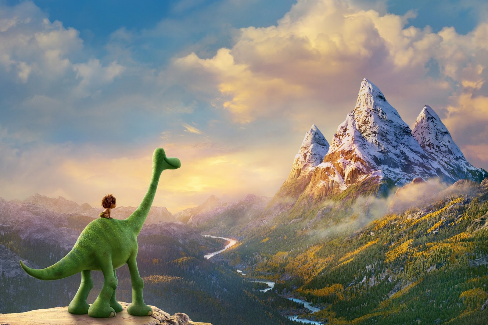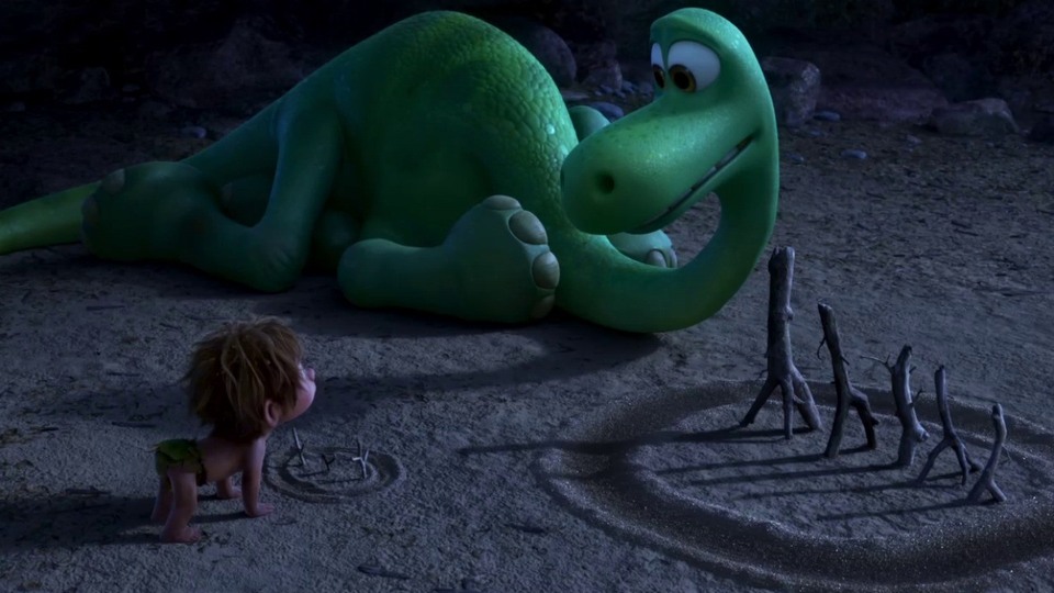 Whether it’s to parents, to Andy’s bedroom or to the headquarters of Riley’s consciousness. Pixar movies, more often than not, revolve around physical journeys. Whether these be metaphorical journeys into adulthood or simply into change and new life experiences, we are familiar with following Pixar protagonists as they try to return to the safety and comfort of home. The Good Dinosaur is no exception. Following a devastating loss, timid young herbivore Arlo finds himself alone in the unfamiliar and daunting world. With the help of a feral child, Arlo must find his way home. Similarly to Nemo, our little dinosaur meets an array of different species and characters along the way – learning about courage and fear as he goes. Sadly, where the greedy seagulls or rehabilitating sharks remain in our memories over a decade after Finding Nemo’s initial release, The Good Dinosaur fails to bring enough humour or personality to its limited collection of dino-individuals. “It’s not much good but there is a dinosaur in it” is my favourite tweeted review of the film that I’ve read so far; rather harsh but pretty fair. There’s a lot to like about The Good Dinosaur if you ignore its troubled narrative. The problematic production is evident in the final product which struggles to flow smoothly from one scenario to the next. There’s emotion and heart here but it’s all somewhat stuck together with the cinematic equivalent of paper mache. The Good Dinosaur is supposed to be a coming of age story, set within the boundaries of a road-movie. Yet, its central themes of courage and bravery get lost amongst a plot that seems to lack confidence and forget about its target audience. Friendship, family, loss, fear and responsibility – just some of the too many themes that cloud the film’s focus.