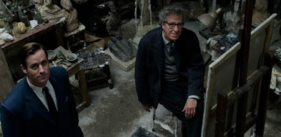 Most of the film takes place in the artist’s studio as Lord experiences the agony of sitting for a self-doubting and tortured Giacometti. The studio itself is a startlingly accurate recreation of the real thing. A cluttered, visceral space filled with clay and paint and half-finished sculptures filling any potential free space. Alberto moves erratically through the space, often irritated and sulky, unable to remain still. He moves through conversations whilst moving from each piece of unfinished work; moulding, shaping and creating constantly. Struggling with his art and meanwhile chained to an openly dishonest marriage and an affair with a Parisian prostitute, Giacometti is a turbulent and selfish soul. He is captured exquisitely by Geoffrey Rush who makes him human through both pain and humour. Armie Hammer is the perfect American writer whose torturous experience of sitting for a painting opens a window into the turmoil and contradictions of the artist, the man and the miserable. The women in this picture are played with energy and sorrow by both Clemence Poesy and Sylvie Testud. Meanwhile a wonderful turn from Tony Shalhoub as Alberto’s gentle brother provides a calming presence amidst the chaos and claustrophobia his character surveys. Final Portrait is a masterclass in cinematic precision and a testament to the confident directorial efforts of Tucci and the actors he has chosen to surround himself with.