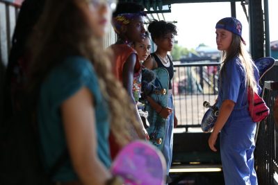 I wasn’t charmed by the film’s presumably spontaneous, improvised dialogue and I found a few pieces of dramatised script were delivered all too awkwardly. Outside of the skateboarding at the film’s centre it was very difficult to care about the fictitious relationship-based drama that surrounded it. Ex-boyfriends, narrow-minded parents and teenage angst are all just white noise encroaching on what the film actually captures much more powerfully; badass, progressive, refreshing female skateboarders. The group themselves seem desperately interesting and charismatic – at their most heroic when gliding down Manhattan streets, a mighty army looking mighty cool. I just wish that the film had followed in the footsteps of All This Panic as opposed to leaning more towards all this fiction. I wish that Moselle had had the confidence to show the girls as they truly are, fully authentic, without the distraction of layers of unconvincing drama. Throwing Jaden Smith into the mix was unnecessary and altogether a little baffling; although to his credit the prolific young star sinks quickly into the material of the film. The girls, as a community, are the beating heart of Skate Kitchen – the film, at its most glorious when the group are simply observed indulging in hazy conversation, coaching one another on ambitious board tricks or partying into the night. There’s a sense of community, safety and sensibility here – one unlikely to have been achieved with purely dramatic performances. The film does a wonderful job of capturing an undefinable time between adolescence and adulthood where young women prosper surrounded by other strong-minded women, all indulging in a life long sporty form of self-expression.